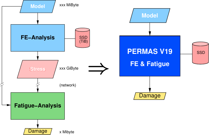 PERMAS V18 needs 5.5 h with stress export and 4.25 TiB database disk space plus about 1.5-12h for the external fatigue analysis.